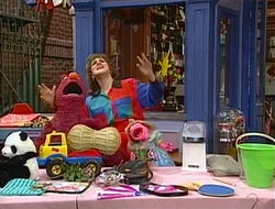 COMING SOON | Coming soon on Sesame Street: Telly, Ruthie, and Prairie Dawn sing about the P sale at Finders Keepers, which attracts a large and enthusiastic crowd. |