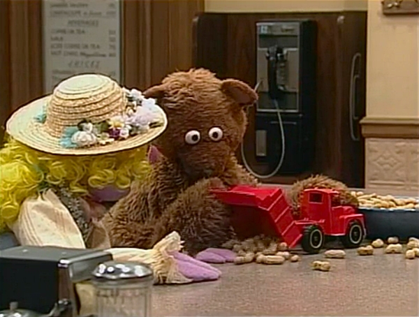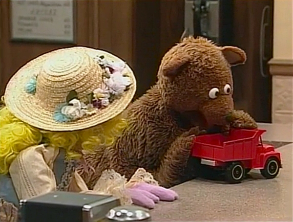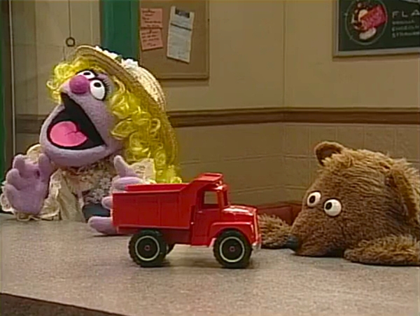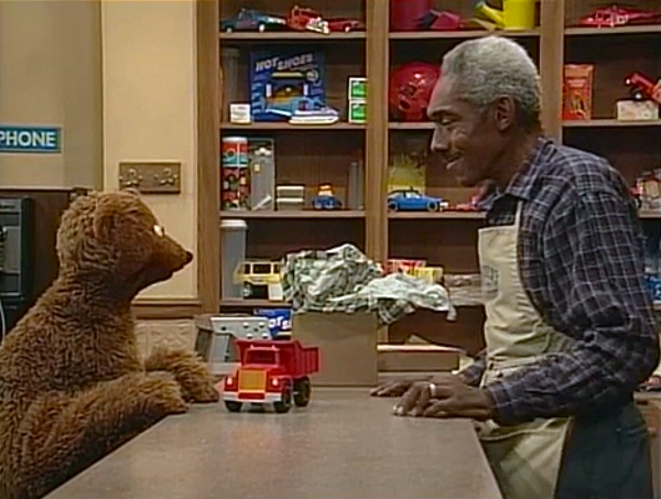 SCENE 4 | Baby Bear finally relents to play with the truck, but won't ruin it by filling it with dirt or rocks per Goldilocks' suggestion. Instead, Mr. Handford provides them with some peanuts, which keep the truck in tact as Baby Bear empties and fills it. Goldilocks wants a turn, but Baby Bear won't allow it based on their history. Goldilocks understands and walks out of the store feeling sad; Baby Bear wonders if he did the right thing. |