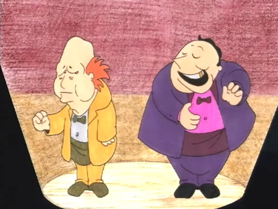 Animation | An opera house is full when an operatic tenor sings, but it becomes empty when his partner (of lesser musical talent) attempts to sing. On their way home, the tenor and his partner become stuck on the freeway, where the lanes are full - but all it takes to make them empty is some bad singing. Animator: Gene Barretta |