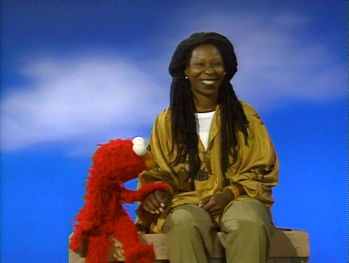 Muppets / Celebrity | Elmo thinks that Whoopi's skin is a very pretty brown. Whoopi likes Elmo's soft red fur. Elmo admires Whoopi's bouncy hair, too. Elmo suggests that they trade, but Whoopi says that they can't -- it doesn't come off. But even if she could trade, she wouldn't want to. She likes her skin and her hair, and she wants to keep it. Elmo says that he wants to keep his fur, too. (First: Episode 2746) |