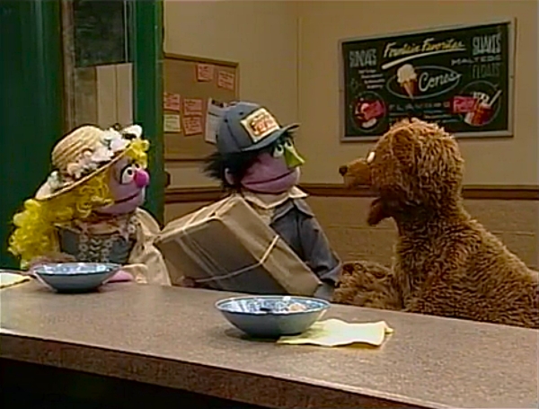 SCENE 1 | Baby Bear and Goldilocks have porridge together at Hooper's Store when a delivery man from Fairytale Express arrives with some packages. They both hope they get one, but he has a supply of aprons for Mr. Handford instead. The delivery man (Jim Martin) also happens to have a package for Baby Bear, who delightfully postpones opening the box so he can proudly read his name on the label over and over. |