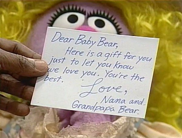 SCENE 3 | Baby Bear finally opens the envelope, containing a card. It reveals the truck is a special gift from Nana and Grandpapa Bear, just to show him they love him. Goldilocks wants to play with it, but Baby Bear thinks it's too nice to be played with and suggests they just admire it for awhile. |