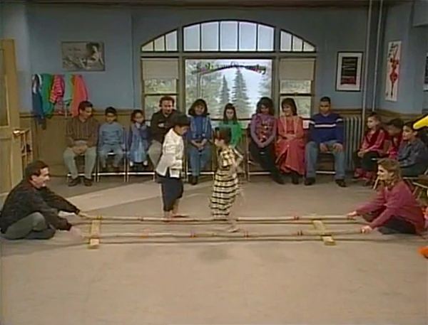 SCENE 1 | From her dance studio, Celina welcomes the viewer and the incoming guests to "Dances from All Over Day," featuring a number of dances from various cultures of the world performed by children. Big Bird teases that he is going to do a Four Bird Dance with Lexine, Gabi, and Spencer, who is currently absent. Celina introduces the first performance - the Tinikling, a type of dance popular in her home country of the Philippines. Tarah plays out the rhythm on some drumsticks as Bob and Gina assist by moving long bamboo sticks that Lexine and another kid dance in and out of. |
