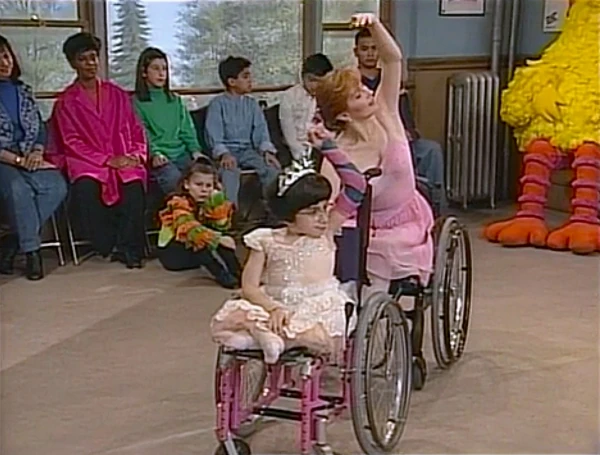 SCENE 3 | Up next is a wheelchair ballet done by choreographer Tarah and her grown-up friend Kitty. Big Bird wonders how Tarah can dance from her wheelchair, and she reminds him how there are many kinds of dancing. Tarah and Kitty perform an elegant ballet, moving their chairs and arms gently to the music. Big Bird compliments her dancing and choreography work, though he has trouble trying to pronounce the latter. |
