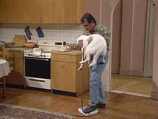 SCENE 2 cont'd | Since the photo won't accurately depict how big he is, Luis produces a scale to weigh him with. Luis picks up the dog and stands on the scale with him, then subtracts his weight from the total to get the dog's. Maria finishes the poster and goes to get her purse, when the dog chews up the poster. Big Bird and Gabi take it as a sign he wants to stay. |