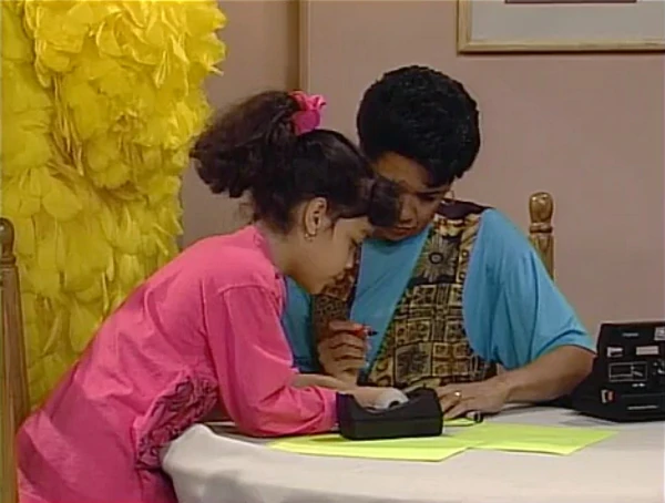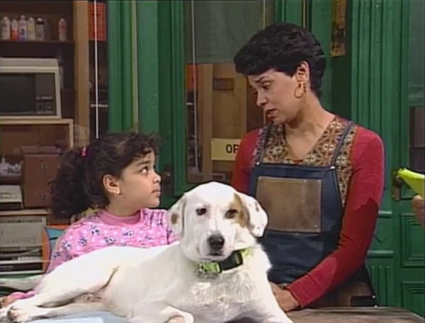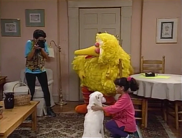 SCENE 2 | Maria waits back at home when Luis, Gabi, and Big Bird return with the freshly-groomed dog, whom the vet claims is less than a year old. Maria gets the dog ready to snap a photo of him for the "Lost Dog" posters she'll be making. She starts getting some info down on the paper, such as their home phone number and that of the Fix-It Shop. |