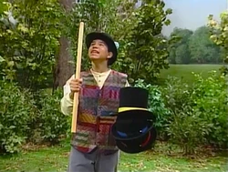SCENE 2 | As the story continues, the ballplayers leave the stick behind as they go get a drink. Soon, a hat catcher (Carlo) comes by, sad that one of his hats is stuck out of reach in a tree. He spots the stick and uses it to retrieve the hat, making him happy. The ballplayers return to see their stick is gone, and they join the princesses as they all sob together. |