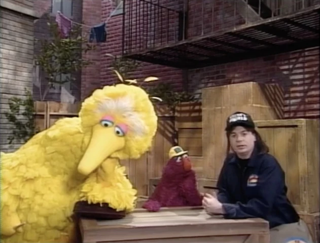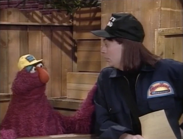 The Four Tuba Guys (the only rock and roll tuba group to exist) don't show up, but instead Telly and Big Bird find themselves face to face with a deliveryman, Wayne (Mike Myers). Wayne has a telegram from the Four Tuba Guys, which Telly is dying to hear. Before he reads it, however, Wayne makes a long speech about how excellent it is that there is such a thing as reading. The telegram from the band says their plane has been delayed, and they will now be traveling by train. |