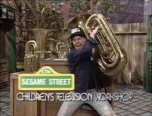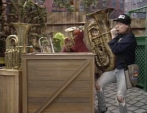 Big Bird calls for an extreme close-up on Telly as he panics, but as it turns out, Wayne plays the tuba himself ("This telegram gig is just a stopover on my way to stardom! I'm gonna be the best ever heavy metal tuba guy in the world!"). He even brought a couple of his tuba-playing friends: a Garth-esque green monster with glasses (Joey Mazzarino), and Slimey. That only makes up three players, but if they add Telly to the group, they can be four tuba guys themselves! Big Bird gives the group an introduction and they all play the Sesame Street Theme, with Wayne performing an impressive tuba solo. Big Bird announces the sponsors. |