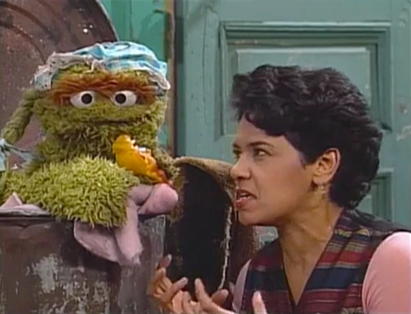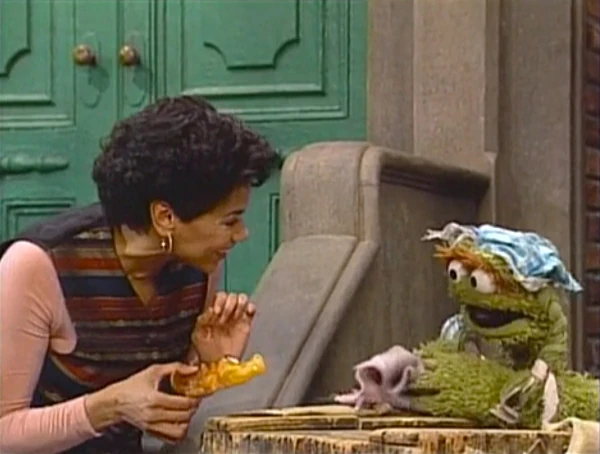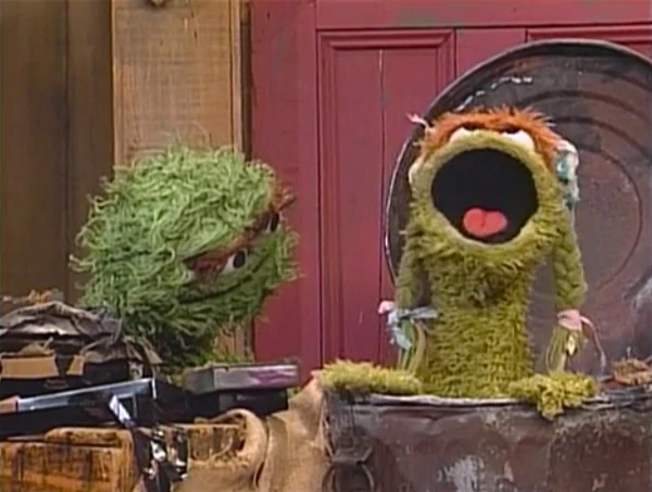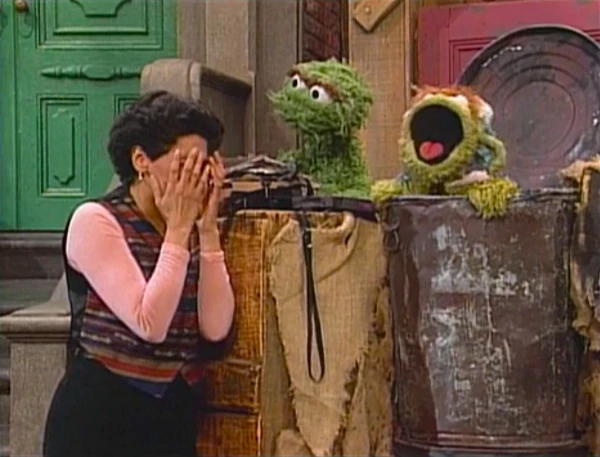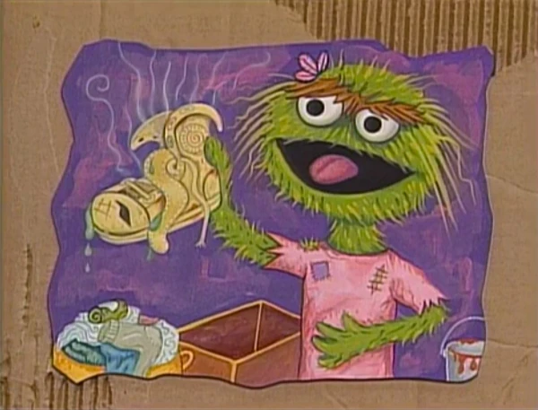 SCENE 1 | Oscar attempts to separate Irvine from her blanket; he wishes to put it through a mud wash to make it even dirtier, but Irvine refuses to let go. When he gives up, Maria (having been through the situation before with Gabi) offers to help. Her solution is to get Irvine to exchange her blanket for her squeeze-toy alligator. She hands Irvine the toy, but the Grouch child keeps both instead. |