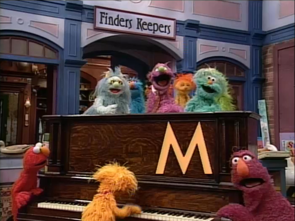 SCENE 1 | A giant letter M sits in the middle of the yard as majestic music plays. Telly and Elmo point out that M is for "Monsters." Zoe, Rosita, Humphrey, Ingrid, and Natasha show up, making them "More Monsters"; Merry, Frazzle, and some other monsters surround the M next, and now there are "Many Monsters" - which is what Elmo says they'll be seeing on Sesame Street today. |