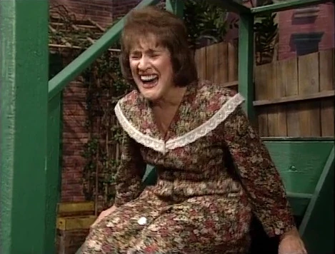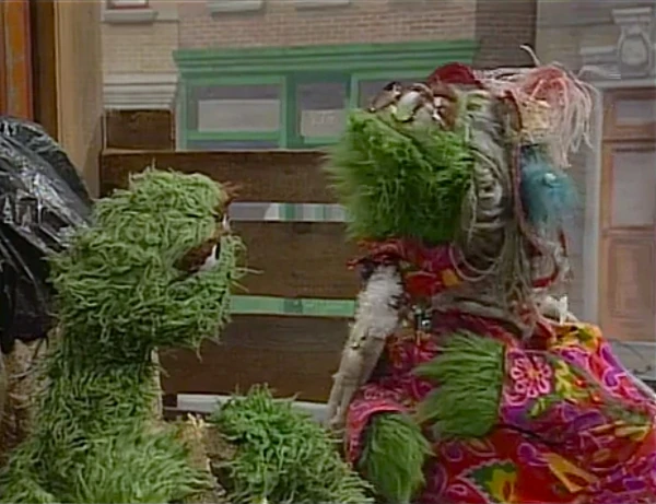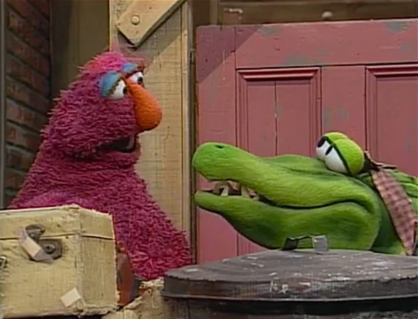 SCENE 5 | Telly has passed the test, meaning Oscar can finally leave. They see the Grouch Air flight above them and Mrs. Grouch drops from it. She has gotten tired of waiting for Oscar to leave, so she has come to Sesame Street instead. Due to the short notice, she was unable to find a sitter for Ally, her pet alligator, so she's brought her along too. Since Telly was already going to pet sit, she leaves him in his care while she drags her son off to the dump's local restaurant. Telly puts the menacing gator to sleep with the lullaby, then announces the sponsors. |