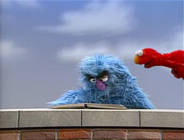 Muppets | Elmo tries to see what Herry is reading, but since Herry's too big, he tries to stand at various angles to look around his shoulders. (First: Episode 3631) |