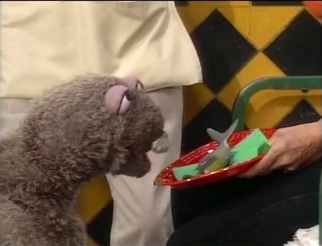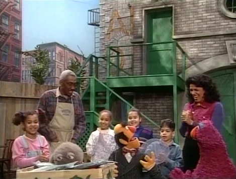 SCENE 1 | Maria introduces the sponsors as she snacks on a knish at Hooper's Store. This attracts a frenzied Wolfgang the Seal, who mistakenly thinks it's a fish since the words rhyme. He does the same when Telly's friend Trish stops by. Mr. Handford goes to check if the store has any fish to calm Wolfgang down. |