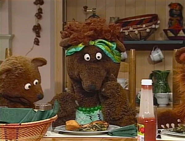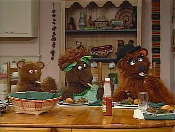 SCENE 4 | As the Robinsons dish out the food, Mama Bear asks what porridge theyβve made, naming all the different varieties theyβve had (Chinese, Japanese, curry, matzah ball, etc.). However, the Bears are shocked to learn theyβre not having porridge tonight. Instead, they're dining on chicken, collard greens, and cornbread. The Bears are a little reluctant at first, but they try each new food one at a time and discover they like it! |