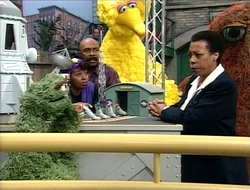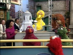 SCENE 1 | Everyone on Sesame Street (including Maria, Luis, Big Bird, Snuffy, Herry Monster, Telly, Elmo, Zoe, Rosita, Tarah, John Tartaglia, Ruthie, Gina, Gordon, Susan, Miles, Irene Simon, Lexine, a Honker, and various other residents) has gathered in front and around the yard for the space shuttle launch. |