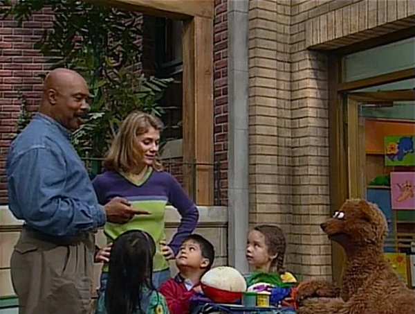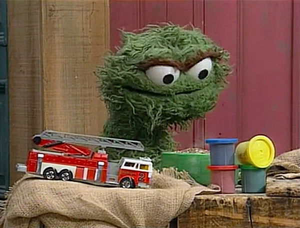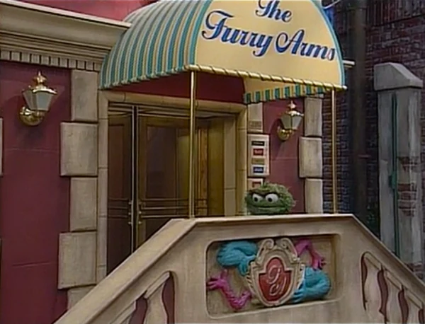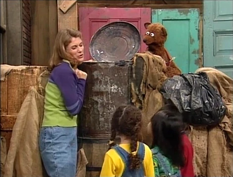 SCENE 4 | Oscar quietly informs the viewer he's decided to give the stuff to Gina's after all, claiming the only reason he's doing it is because the items are too nice for his taste. He places the items at the day care center's door, then runs off and watches from outside the Furry Arms Hotel. Gina, Baby Bear, and the kids rummage through the items excitedly; Baby Bear especially loves the toy freight train and string of fake frankfurters. Oscar realizes he's feeling happy watching them and decides to leave: "I'd better get out of here before I start pettin' bunny rabbits!" he exclaims. Gordon comes across the group and recognizes the playthings all came from Oscar. The day care group decides to head to Oscar's trash can to thank him. |