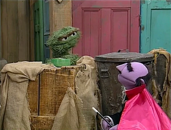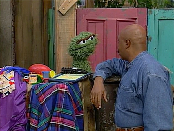 SCENE 3 | Mumford tells Gordon about his trick, having produced several more F-word items like some fabric, feathers, a football, and a can of fish flakes. By now, Oscar's oatmeal has cooled down so he wouldn't need the fan anyway, though Mumford still takes credit for taking so long with his trick and "timing it right." He heads off to a magic convention, forgetting to get rid of all the junk he made magically appear. Oscar considers keeping them to make them trash, but Gordon thinks he should instead give it to Gina and the kids at day care. Oscar claims a Grouch wouldn't do such a thing, but Gordon suggests he think it over. |