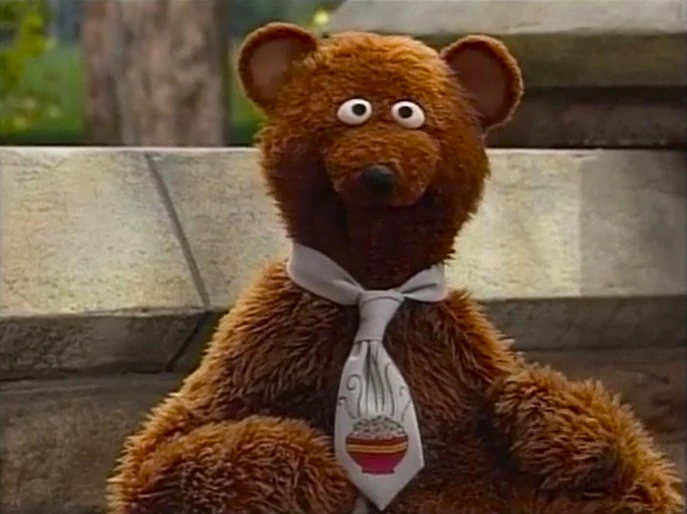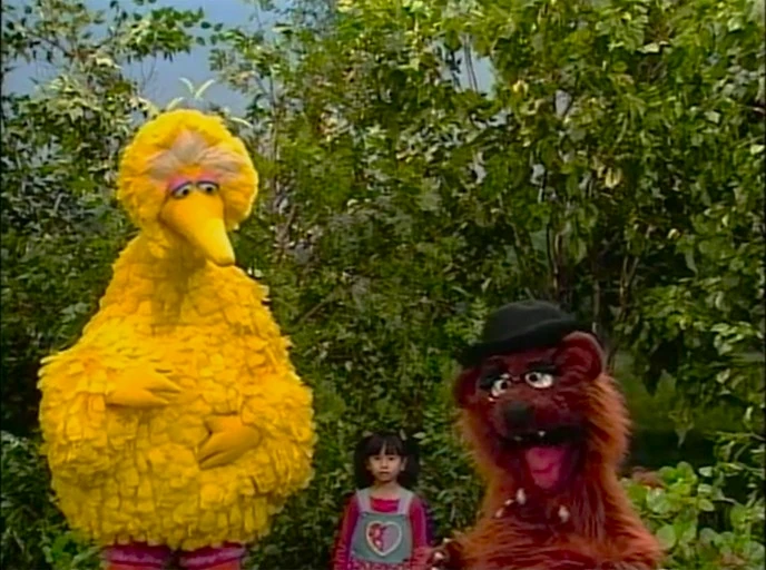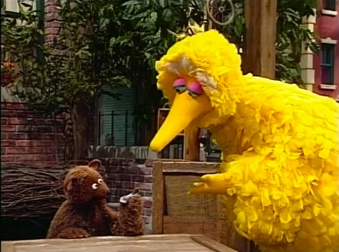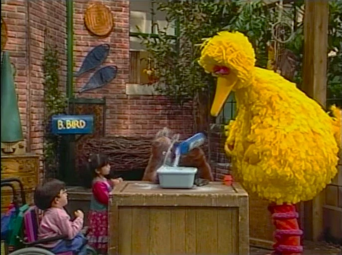 SCENE 1 | Big Bird and Lexine run into Baby Bear, who's wearing a nice, new tie with a picture of a porridge bowl on it. He states his family will be visiting their grandmother, and Papa Bear will be around any moment to pick up him. The two want to say the alphabet, but Baby Bear is unsure as he doesn't want to put his tie in any harm: "Things can happen between A and Z, I mean, there's a lot of uncharted territory in there." He removes his tie and places it on the park wall so it won't get dirty as they all say the alphabet. He puts it back on, then immediately takes it off when he learns what's coming up... |
