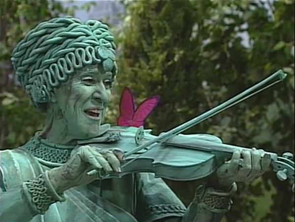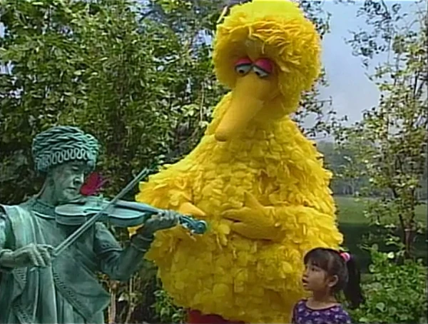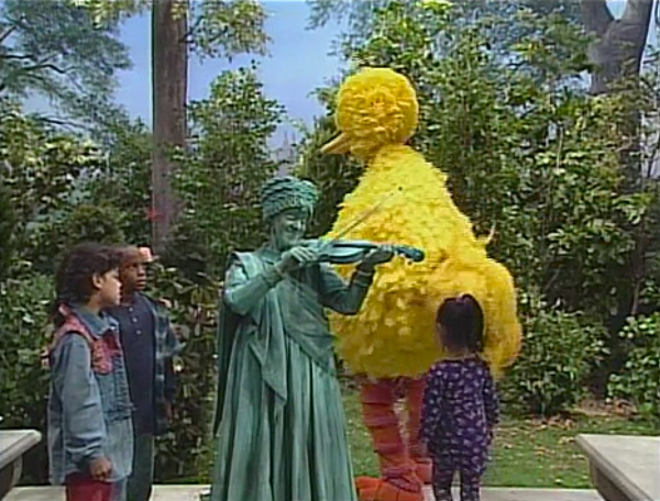 SCENE 2 | Big Bird and the kids follow the butterfly into a different section of the park they've never visited before. While they aren't looking, it lands on a nearby statue and Big Bird and Lexine hear sad violin music playing, though Gabi and Miles don't. Big Bird and Lexine follow the music, learning that the statue is playing the violin. The statue can also talk, and the frowning figure (Ruth Buzzi) reveals that she feels useless being a statue. All the while, neither Gabi nor Miles are able to see and hear the conversation had between the statue and the others. Lexine thinks the statue is pretty to look at, and Big Bird points out that the (smaller) birds can sit on her to rest. Now she feels happy to be a statue, and plays happy-sounding music. |