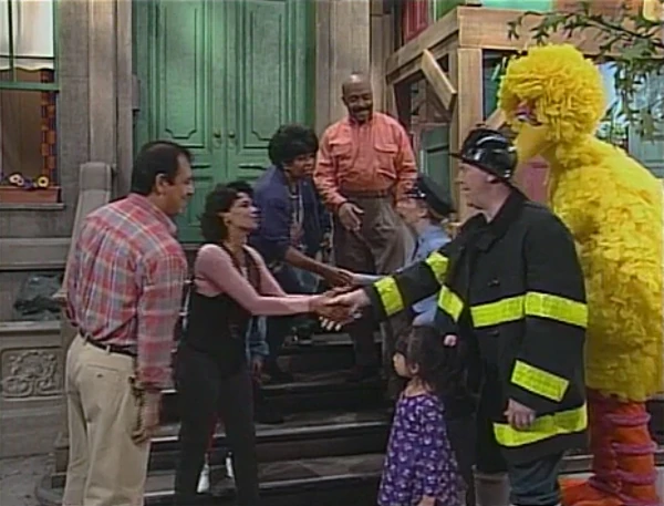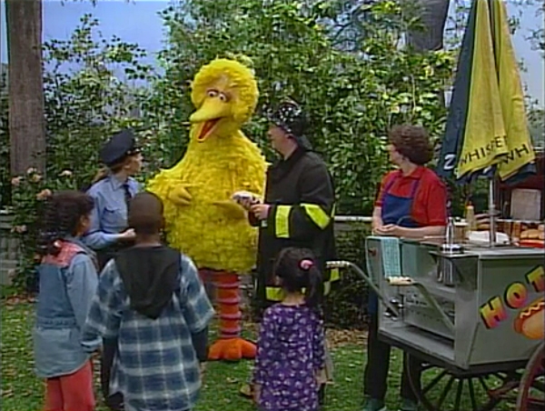 SCENE 5 | Big Bird and the kids suddenly lose track of the butterfly, and realize that they're lost. They know to seek the aid of a grown-up in uniform, and nearby they spot a policewoman (played by writer Christine Ferraro) and firefighter (John W. Griffin) dining by a hot dog cart. They and the cart's vendor (Maria Nevada) know how to get to Sesame Street by its theme. The officer and firefighter proceed to lead the kids home, though Big Bird tags behind briefly to ask the concessions lady for a pretzel before he leaves. |