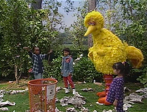 SCENE 4 | Big Bird and the kids follow the butterfly into a littered section of the park. Big Bird assumes that maybe the butterfly led them there so they could pick up all the trash. |