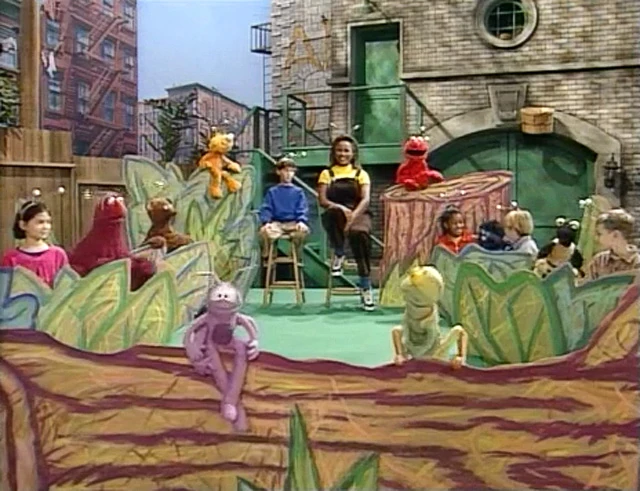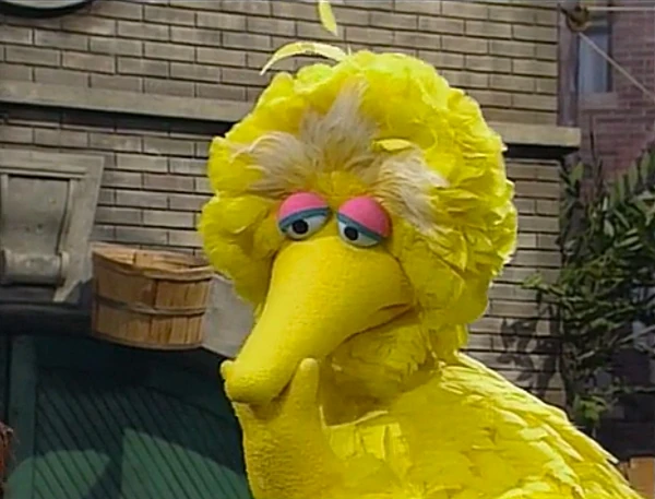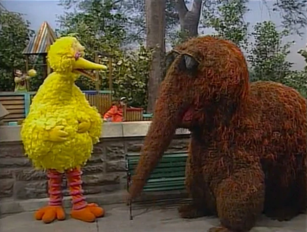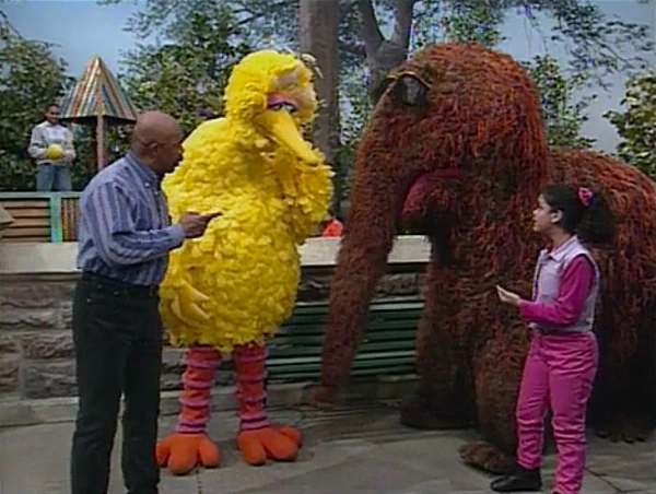 SCENE 4 | At the playground in the park, Big Bird and Snuffy go over what they found out on their quest: Gordon rubs his chin, Gabi scratches her head, Maria says "Hmmmm," Luis drums his fingers, etc. Snuffy thinks that if Big Bird does all the things they witnessed, he'll be able to answer any question at all. Snuffy asks him one that he heard on Mister Rogers: "What do flowers need to grow?" Big Bird rubs his beak, scratches his head, goes "hmm," drums his fingers, bounces up and down, says "oh, oh, oh," while patting himself on the forehead, and touches his cheek... but when he's done, he's forgotten the question. He encourages Snuffy to keep asking, but Snuffy's forgotten it, too. |