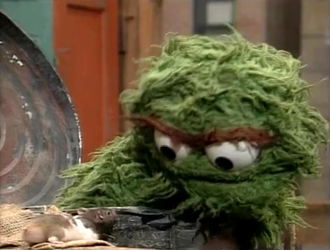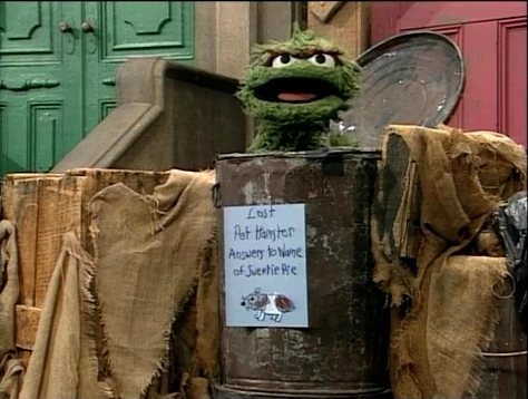 SCENE 4 cont'd | Meanwhile, Sweetie Pie has made his way to Oscar's trash can, where Oscar notices him. He brings the hamster inside the can, where he has a squeaky exercise wheel for him to use. Telly rushes by in his search, while Oscar considers naming the hamster "Mister Mud." |