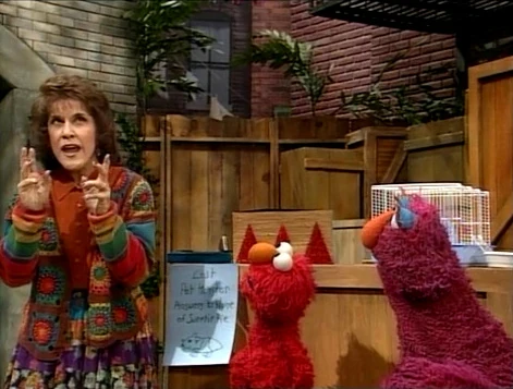 SCENE 5 | More kids have joined the "hamster tracking patrol," crawling as if they are hamsters. They've also created several signs concerning the lost creature, as Elmo and Telly explain to Ruthie. She recalls going through a similar process in helping Mother Goose find Hickory, Dickory, and Dock (the mice who ran up the clock). She scurries around acting like a hamster when an Anything Muppet woman (Fran Brill) appears, believing she is whom they are looking for (her husband endearingly calls her "Sweetie Pie"). |