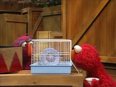 SCENE 3 | Elmo continues watching Sweetie Pie when he notices his water dish is empty. Elmo wonders what to do - he can't leave his post, but Sweetie Pie needs water. He opens the cage door and grabs the water dish, promising to only be gone a minute while he runs over to Hooper's Store. Just as he leaves, Sweetie Pie starts crawling over the open cage door... |