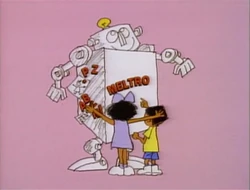 Cartoon | Melba spells her name and her brother's name on their robot, Meltro. (First: Episode 3363) |