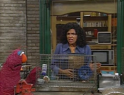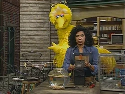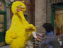 SCENE 6 | Trilby tells Big Bird (through tweeting) that he feels left out, as all the other pets are on the workbench and his cage is perched on a stool. Maria has no more room to work if they put the bird on it, but relents and decides to work inside. However, Trilby tweets some more and Big Bird translates that he'll be sad if he makes her leave, so Maria tries her best to repair the toaster on the stool. |