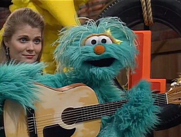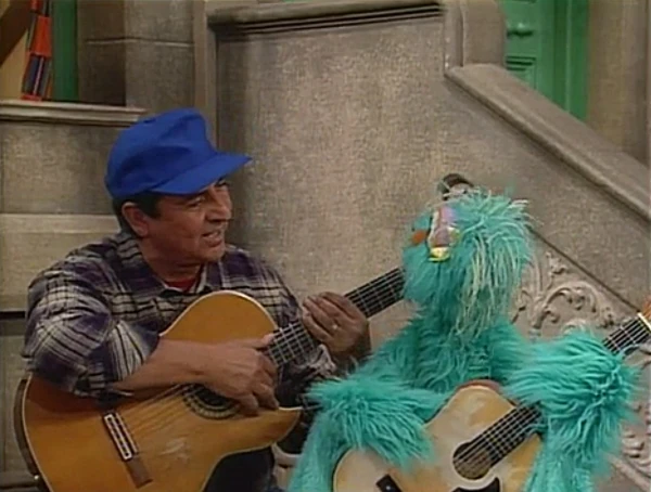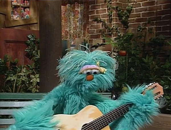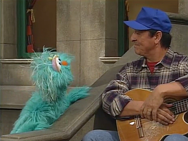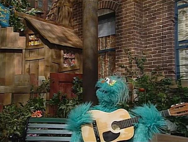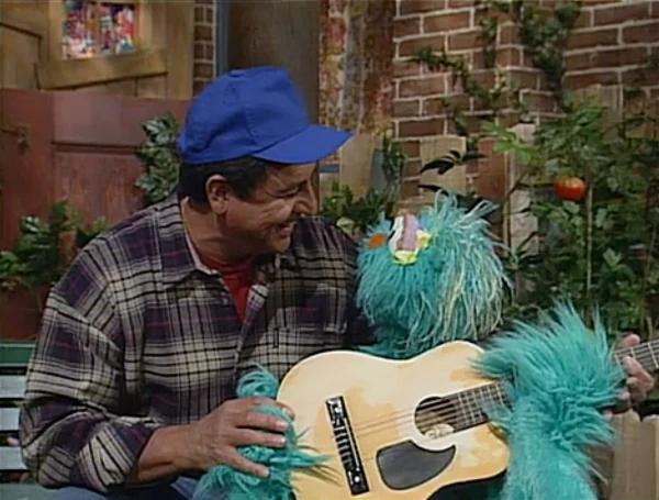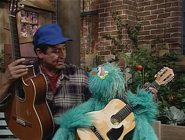 SCENE 2 | While waiting, Rosita imagines making beautiful music on the guitar. Wearing the same blue baseball cap that Luis was wearing earlier, Rosita pictures herself earning praise from Big Bird, Baby Bear, Zoe, some kids, and even Oscar ("How can I possibly be grouchy when Rosita plays her beautiful song?"). Back in reality, Luis brings his old guitar for her to use. |