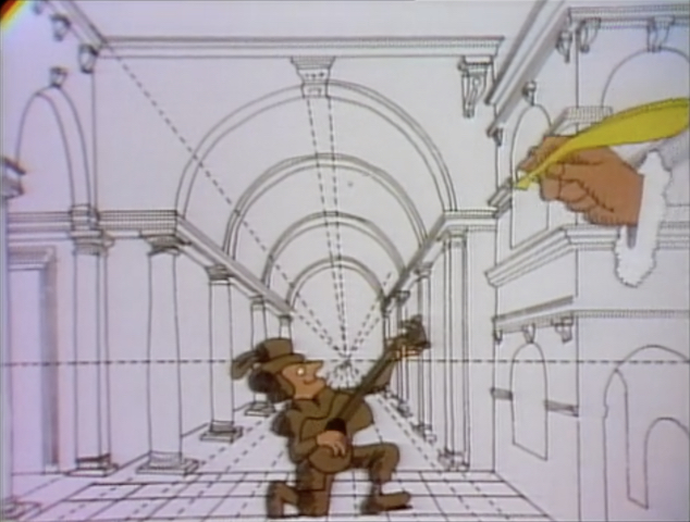 Cartoon | A hand draws a guitarist serenading a maiden, as well as the background. (First: Episode 0791) |