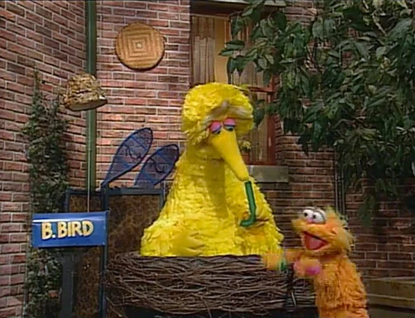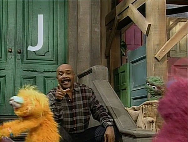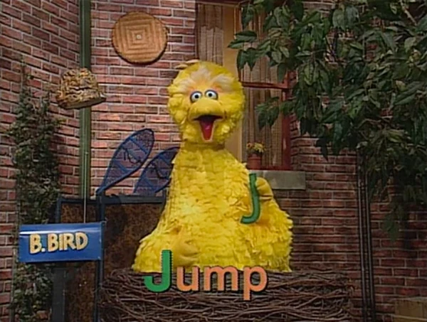 SCENE 3 | Big Bird displays the letter J at his nest and tries to think of a J word. Zoe bounces by on the pogo stick, and Big Bird remembers the word "Jump" while Telly runs after Zoe. |