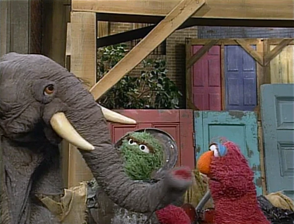 SCENE 8 | An elephant wants to take a ride on the Grouch pogo stick, since Oscar told the elephant he could borrow it before Telly did. Thus, he leaps onto Telly for a few bounces. Zoe boings past and Telly suggests he ask her for a ride, but Oscar and the elephant observe she's too fast and too good for him. Telly vows not to give up, but finds it hard to get past the giant pachyderm. |
