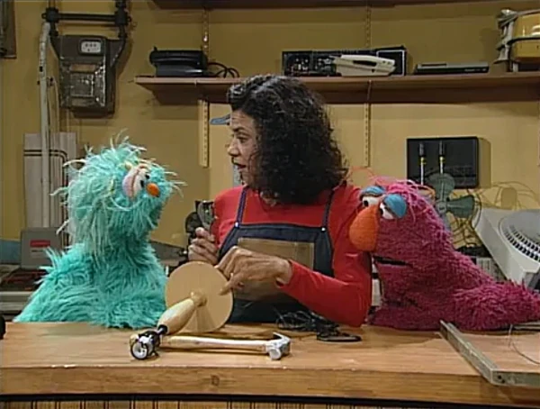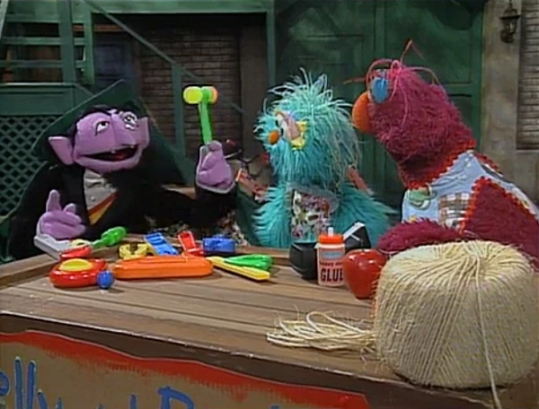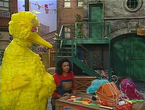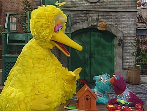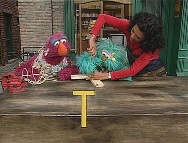 SCENE 7 | The monsters offer to fix Gordon's broken toaster, but he thinks that should be left to professionals and suggests they find something simpler to fix. A man (Jerry Nelson) comes by, needing his letter T fixed. The monsters are eager to help since they know what a T looks like, but they learn his T is really a complex machine; they recommend he send it to Maria (or NASA). Big Bird passes by on his way to Maria's to get his little birdhouse's door fixed and the monsters call out for him. |
