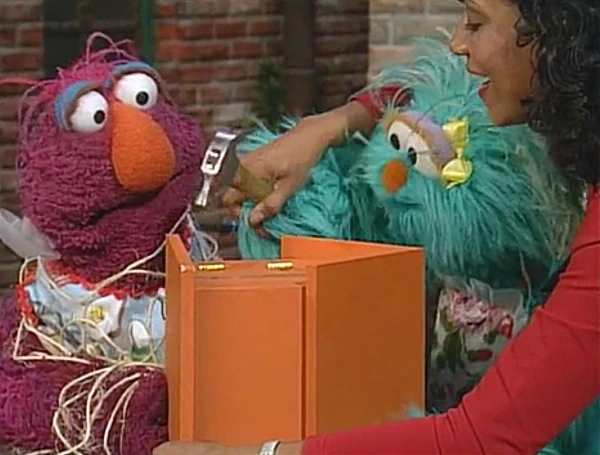 SCENE 10 | Maria has cleaned up the birdhouse and carefully instructs Telly and Rosita as they hammer the hinges while taking turns - one holds the birdhouse and the other taps with the hammer. Big Bird thanks them for the good work, and the monsters decide to stick around to get some on-the-job training. |