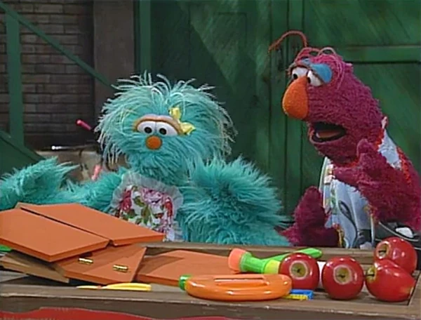 SCENE 3 | Telly and Rosita set up their own Fix-It Shop in the yard. They make sure they have everything they need: a big sign to advertise, toy tools as well as some practical ones like tape, glue, and string, aprons to keep neat, and apples to snack on. The only thing they're missing is customers. |