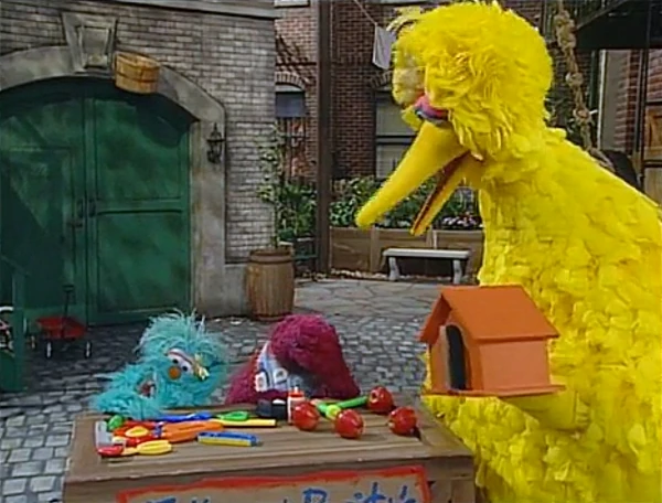 SCENE 8 | Big Bird explains how Maria fixes his birdhouse: five gentle taps of her hammer on the hinges. He leaves it with them, since their business hasn't been thriving. The monsters think they'll do well, but demolish the house with one hit of their squeaky hammer. They desperately try to piece it back together. |