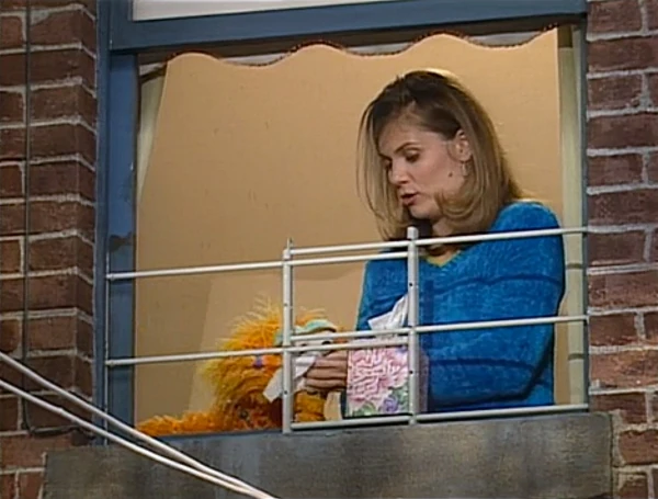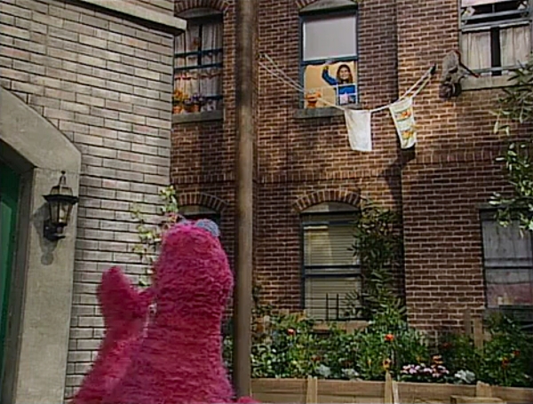 SCENE 5 | Telly reaches Zoe's apartment outside with the 7, only Zoe wants to send Big Bird seven flowers! They provide him a basket and rope through the window to exchange items to make it easier on Telly. |