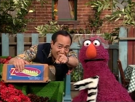 SCENE 4 | Thanks to spending so much time with the Z, Telly is able to notice a number of Z words around him, like "zucchini" and "zinnias." Telly wishes he knew some Z words he's already familiar with. Alan shows off the zipper on his vest, then points Telly toward something with two Zs in it... |