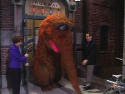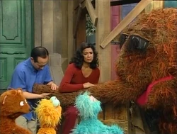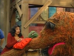 SCENE 9 | Linda thanks everyone for their great work, especially the way Snuffy risked hurting his snuffle for it. Bob is shocked when Linda offers to bring Snuffy on their dinner date; Zoe realizes that Bob is definitely surprised! In sign language, Linda thanks Bob as the three of them head out to dinner, and the camera pans to Elmo's apartment... |