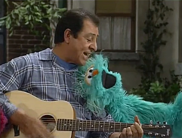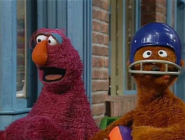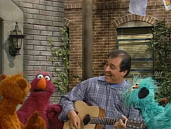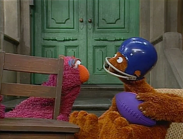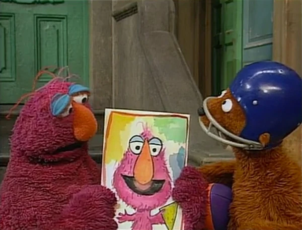 SCENE 5 | Telly explains his situation to Luis and Rosita, who suggest that he give Baby Bear the gift of a song. They start singing "Amigo," and Telly tries learning it to sing to Baby Bear. He just happens to show up and is already familiar with the song. He has them continue singing it and dedicates it to Telly, who runs away. (Baby Bear: "What, you don't like my halftime show?") |