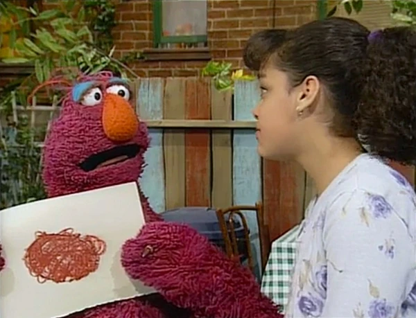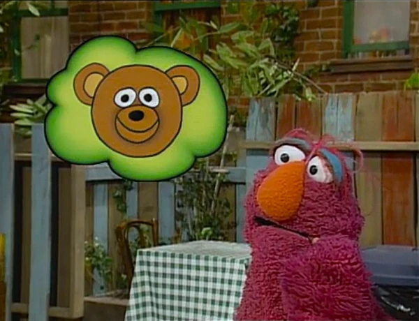 SCENE 2 | Gabi comes across Telly, who is currently working on a crayon drawing in the yard, though Gabi can't tell it's supposed to be of Baby Bear. Telly shows her the picture Baby Bear made, and he wants to show Baby Bear how much he likes him by doing the same. Gabi instructs him to imagine Baby Bear in his mind to help him make a more accurate picture. Telly finishes his drawing and runs off to show his best friend. |