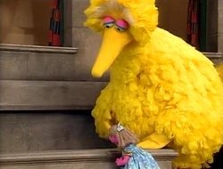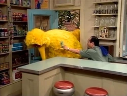 SCENE 3 | Big Bird follows the ant into Hooper's Store and tells Alan what he's up to. Big Bird's starting to get hungry so Alan fetches some birdseed snacks from the shelf, only he can't keep up with Big Bird to serve them. Big Bird holds out his wing as he passes through the store again and Alan places the box in his wing. |