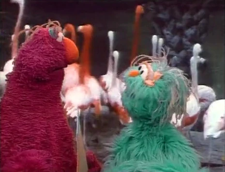 Film | Flamingos walk around to classical music. (new child voiceovers added, mostly cut for this airing; sound effects added) (First: Episode 2498) Telly and Rosita appear over the film at the beginning, searching for their next item. |