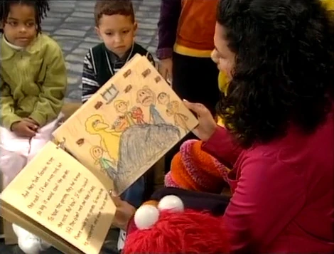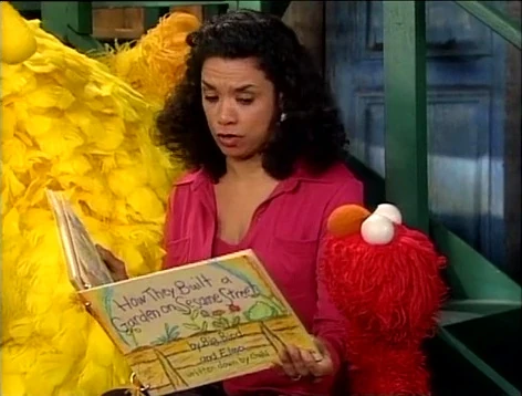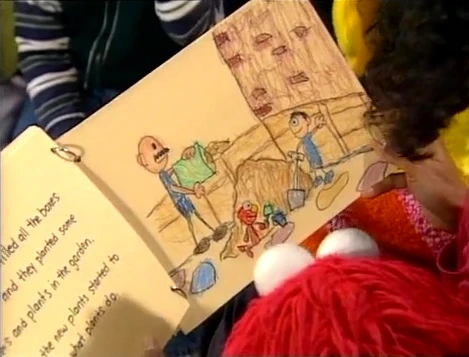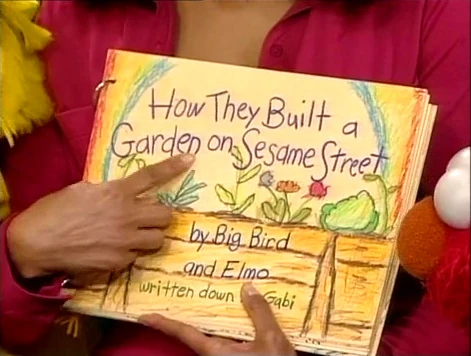 SCENE 1 | In the yard, Elmo shows Maria and some kids the book he wrote with Big Bird and Gabi. Maria agrees to read it to them (and the viewer), and Elmo reveals that there's a surprise at the end. Maria starts by reading the front cover of the book, then begins reading the story of "How They Built a Garden on Sesame Street." |