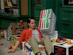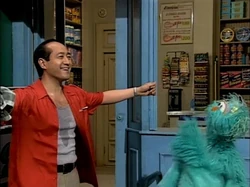 SCENE 3 | At Hooper's Store, Alan has become exhausted and sweaty from moving boxes into the store. Rosita runs into him and thinks about what to do with her wings while flapping them. Alan points out that her wings can generate a cool breeze which feels refreshing to him after all that hard work. Rosita feels proud of her newfound talents - so proud that she flaps her wings faster and blows Alan down! "Maybe I'll just go buy a fan," he says as Rosita leaves to look for more uses for her wings. |