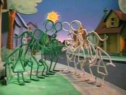 Animation | A white pipe-cleaner family is wary of their new green neighbors. When they see the two babies playing together, they warm up to each other. |